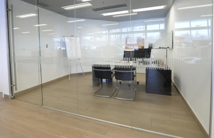 It is ideal for spaces where comfort and quiet are essential, such as meeting rooms, executive offices, or areas requiring a certain level of isolation. Thanks to the double glazing, the partition provides a more effective barrier against ambient noise while preserving a light and elegant look.