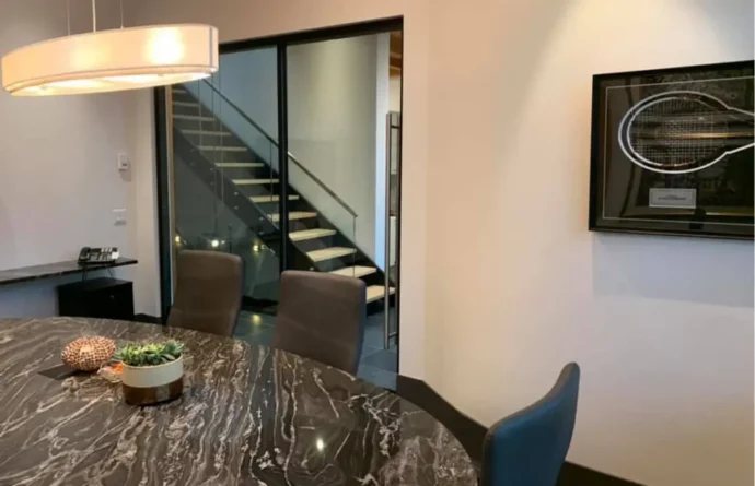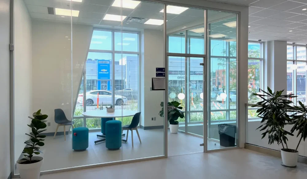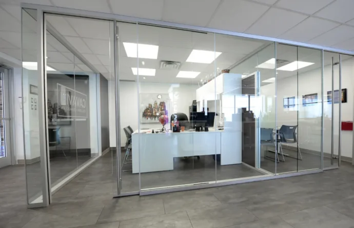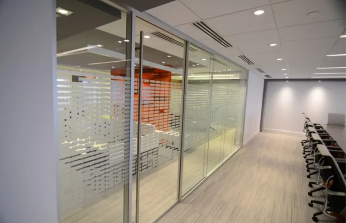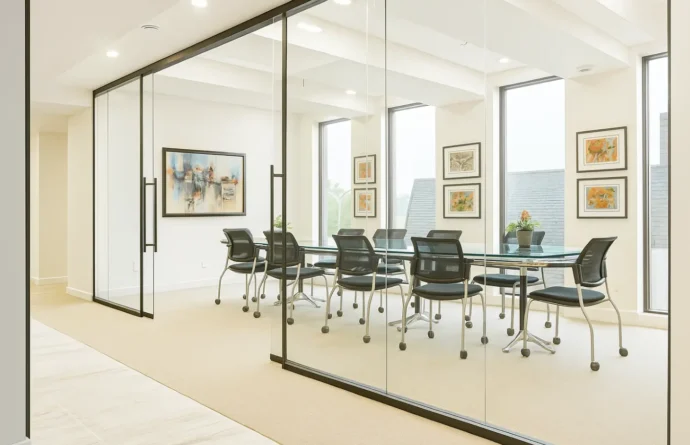 Its double glazing creates quieter, more insulated spaces—ideal for meeting rooms, executive offices, or areas where concentration is essential. The option to integrate solid panels in wood, laminate, or other finishes adds an extra layer of flexibility, allowing designers to balance transparency and privacy according to the project’s requirements.
